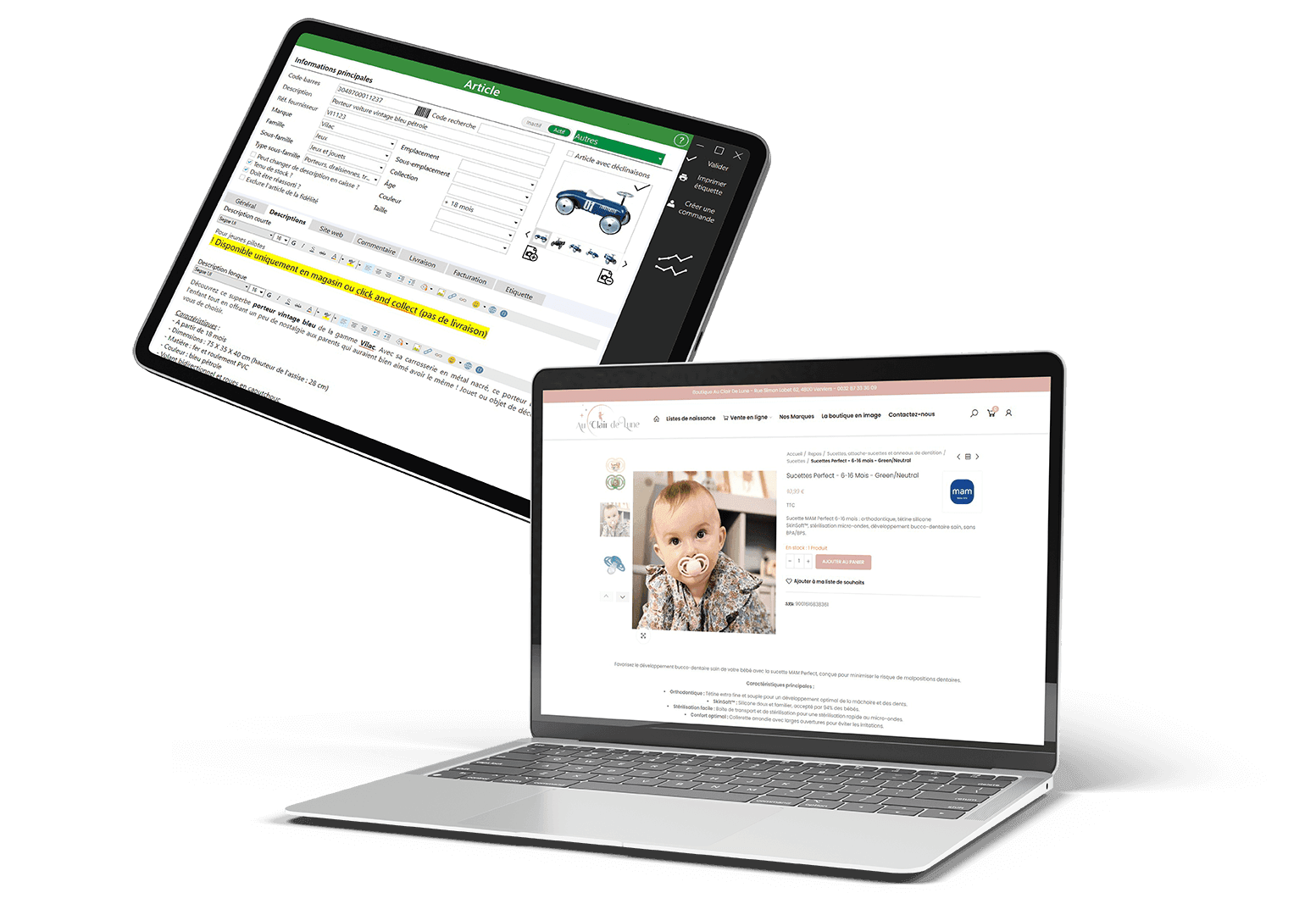 Avec NetBee, Au Clair de Lune pilote l'ensemble de son activité depuis une seule plateforme. Le logiciel retail garantit que le stock est à jour en temps réel sur tous les canaux :